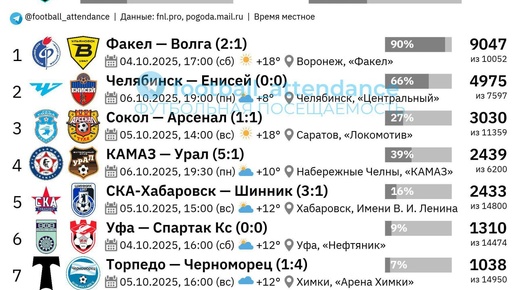Воронежский футбольный клуб «Факел» продемонстрировал лучший показатель посещаемости в 13-м туре Первой лиги сезона 2025/2026 годов. Матч против футбольного клуба «Волга», состоявшийся 4 октября 2025 года, собрал 9047 зрителей, что обеспечило 90% заполняемость домашнего стадиона клуба. Этот результат стал максимальным не только в текущем туре, но и занял 15-ю позицию в рейтинге самых посещаемых матчей сезона...