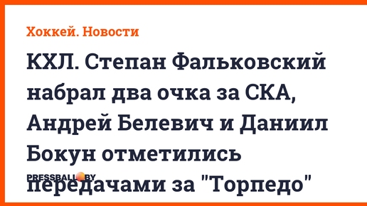 КХЛ. Степан Фальковский набрал два очка за СКА, Андрей Белевич и Даниил Бокун отметились передачами за "Торпедо"