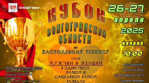 Доброго времени суток, уважаемые любители настольного тенниса!☀️ В субботу и воскресенье, 26 и 27 апреля 2025 года, Волгоградская областная Федерация настольного тенниса (ВОФНТ) приглашает всех желающих спортсменов Волгограда и Волгоградской области принять участие в официальных региональных соревнованиях «Кубок Волгоградской области» по настольному теннису среди мужчин и женщин! Соревнования проводятся в одиночном, парном и смешанном парном разрядах. К участию в личных видах соревнований допускаются мужчины, женщины (2003 года рождения и старше)...