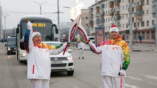 Фёдор Емельяненко пробегает с Олимпийским огнем первые 200 метров эстафеты и передаёт его Анатолию Переверзеву — заслуженному работнику