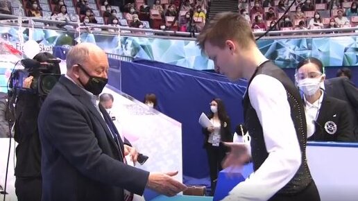 Анна Щербакова и Сергей Дудаков в ожидании оценок на командном чемпионате мира в Японии...