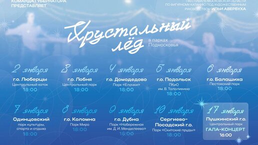 ✨ С 2 по 17 января в парках Московской области пройдет I областной фестиваль по фигурному катанию «Хрустальный лед» под художественным руководством Ильи Авербуха. ✨ С 2 по 10 января пройдут отборочные туры, на которых выступят конкурсанты – фигуристы-любители, и поборются за звание лучших в Подмосковье. Каждое мероприятие будет завершаться специально подготовленным для фестиваля ледовым спектаклем Ильи Авербуха – «Зимние сказки Подмосковья» с участием профессиональных фигуристов: Алексея Ягудина, Татьяны Тотьмяниной, Максима Шабалина и других...