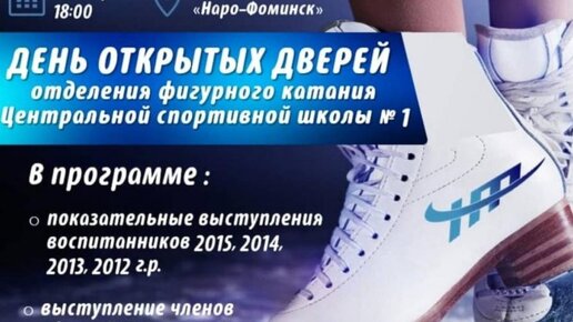 По информации, оказавшейся в распоряжении БИЗБИ, 30 августа в 18:00 в Ледовом дворце на улице Профсоюзная, 36-Б в Наро-Фоминске состоится день открытых дверей отделения фигурного катания Центральной спортивной школы № 1. На мероприятие приглашаются все желающие жители и гости Наро-Фоминского городского округа! В программе: - мастер-класс со звездой фигурного катания Ковалёвым Владимиром Николаевичем – советским фигуристом, двукратным чемпионом мира, чемпионом Европы и серебряным призером Олимпийских...