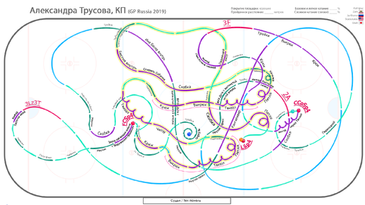 Когда мы смотрим фигурное катание, нам не видно, как фигурист использует ледовую арену, какие фигуры выписывает. Спортсмен катит не от борта к борту, а по определенной схеме, потому что за умение охватить всю площадь катка также ставится оценка. Использование катка можно изобразить в виде карты или схемы, или рисунка, кому как больше нравится это называть. Оцените красоту рисунка короткой программы Саши Трусовой: Как видите, картинка получается красивая, свободной езды совсем мало. Зато крюков, выкрюков, твиззлов хоть отбавляй...