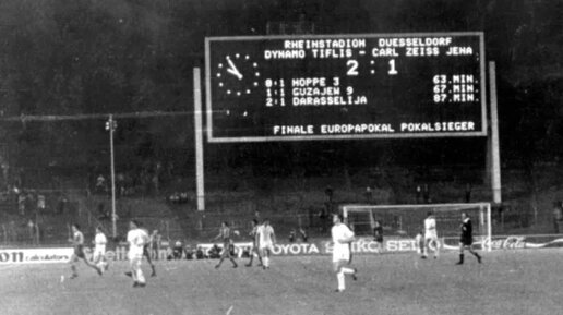 Порадовали тбилисские динамовцы, не зря мы за них болели. Л. Брежнев. Финал Кубка обладателей Кубков, итоговый счёт на табло! "Карл Цейс", после гола Герхарда Хоппе, вышел вперёд. После забитого гола Герхард, видимо на радостях, показал гостям жест и сам того не подозревая, дополнительно простимулировал тбилисцев на победу. Dream Team, команда мечты. Грузины не стали выяснять отношений, после такой нелицеприятной выходки, но жёстко наказали соперника своей игрой. Владимир Гуцаев, гроза вратарей, четыре минуты спустя забивает шикарный, ответный гол, низом, в ближний правый угол...