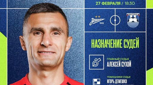 : 🚩 Главный судья — Алексей Сухой; 🏳 Помощники судьи —Игорь Демешко, Александр Богданов; 🏳 Резервный судья — Станислав Матвеев; 📺 VAR — Сергей Иванов; 👀 AVAR — Сергей Чебан. В качестве главного судьи Алексей Васильевич обслужил 17 матчей с участием Балтийцев. В этих встречах наша команда одержала пять побед и пять раз сыграла вничью...