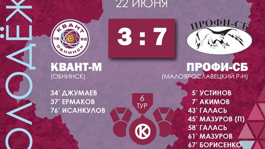 Молодёжка в минувшее воскресенье уступила на своём поле ФК "Профи-СБ" из Малоярославца. Голов в этом матче было неприлично много, в составе Квант-М отличились: Джумаев, Ермаков и Исанкулов.