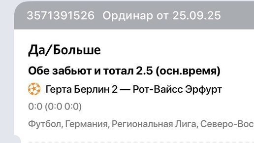 В ответ на пост Выбирал матч с суперзабивными командами, судите сами Герта 2 в среднем забивает 1.9 гола за игру, пропускает 2.3, Рот-Вайсс Эрфурт забивает 2.4, пропускает 1.4 при тотале матчей в среднем 4.2 и 3.9 соответственно у обоих, региональная лига, вообще ни разу не хайп 😎 подстав не ожидалось. Кроме того у Герты - 5 игр дома с тоталом более чем 2.5 гола, у Вайсса - 9 матчей подряд с забитыми мячами (было 😄), кроме того, в последних 5 домашних матчах Герты обе команды обменивались голами...