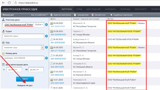 Иски от ООО "Футбольный клуб "Рубин"
