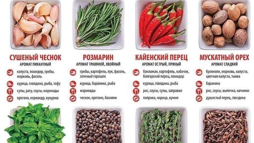 Гид по специям. Все что вам нужно знать о приправах вы найдете в этой статье. Подробная таблица сочетаний основных пряностей.