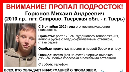 В Спирово Тверской области пропал еще один человек, сообщают волонтеры тверского поисково-спасательного отряда "Сова". Стало известно, что в поселке Спирово пропал Михаил Андреевич Горюнов 2010 года рождения: его местонахождение не известно с 6 октября...