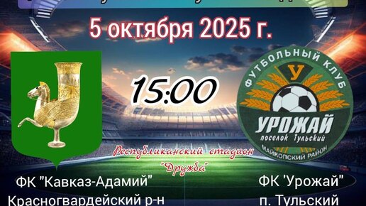 ⚽5 октября в 15:00 на республиканском стадионе «Дружба» в рамках финала Кубка Республики Адыгея пройдет матч между ФК «Урожай» из поселка Тульского и ФК «Кавказ-Адамий» из Красногвардейского района. Поддержать районную команду могут все желающие...