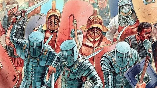 Это вовсе не рыцари Тевтонского ордена атакуют римских легионеров, и у римлян вовсе не по фантазии художника в руках топоры и молоты. Во время восстания галлов под предводительством Юлия Сакровира и Юлия Флора (21 год н.э.), в решающей битве повстанцы применили интересную тактику - выставили в первый ряд закованных в толстую броню гладиаторов - crupellarii. Именно так, по многочисленным рисункам и описаниям, крупелларии и выглядели.