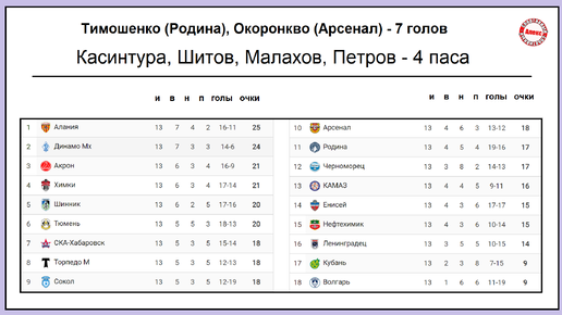 В ФНЛ завершился 13-й тур. Результаты и авторы голов: Расписание: Таблица: