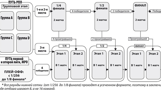 Итак, дебаты закончены - решение принято. Кубка РПЛ не будет, зато Кубок России пройдет по невиданной прежде формуле - с двойным выбыванием Представленная РФС схема на первый взгляд выглядит ужасно запутанной, но на самом деле просто взят на вооружение принцип, примененный в квалификации действующих еврокубков. Точнее, два принципа. Первый: созданы два пути по продвижению к цели (в нашем случае - в Суперфинал Кубка России, а в еврокубках - на групповой этап). Второй - команды, проигравшие в Лиге...