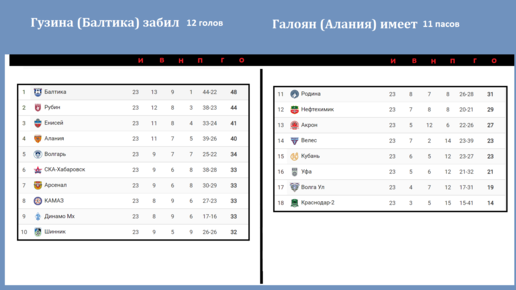 Завершился 23 тур в ФНЛ. Вашему вниманию, Таблица, Расписание, бомбардиры. Начинаем с результатов. «Родина» обыграл СКА 2-0, и продлила серию до пяти побед с учетом товарищеских матчей. Рубин не сумел обыграть КАМАЗ 0-0. Рубин не проигрывает с 5 октября 19 матчей. Полузащитник Шинника Дмитрий Самойлов и Паскин из Волги оформили по дублю...
