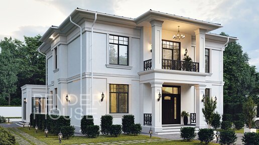 ФОРТУНА — проект двухэтажного дома в стиле неоклассика площадью 310 м². Светлые фасады, колонны, украшающие вход в дом, симметрия декоративных элементов — все говорит о респектабельности и указывает на классический архитектурный стиль проекта. Кровля в стиле Райта и большие окна добавляют облику дома легкости. Это комфортное пространство для большой семьи с 4 спальнями, сауной, кабинетом и террасой. Основные характеристики ● Площадь дома по контуру внешних стен — 310 м² ● Закрытая терраса площадью...