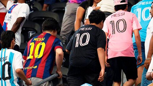 №10. Месси, Месси, Месси, Месси, Месси – нет, это не начало знаменитого мема, связанного с аргентинцем. Так пять фанатов проводили легенду с клубного чемпионата мира. Здесь практически вся карьера Лео: все три футболки «Интер Майами» этого сезона, а также главные команды в его жизни – «Барселона» и сборная Аргентины. Играли против «ПСЖ», поэтому парижской джерси с фамилией Месси не видно. Но не удивимся, если на фото присутствует и такой вариант...