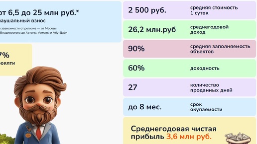 Франшиза в сфере краткосрочной аренды недвижимости Паушальный взнос: от 6,5 до 25 млн руб. (зависит от региона: Москва, Владивосток, Астана, Алматы, Абу-Даби) Роялти: 7% от оборота Показатели бизнеса: — Средняя стоимость суток: 2 500 руб. — Среднегодовой доход: 26,2 млн руб. — Заполняемость объектов: 90% — Доходность: 60% — Проданных дней в месяц: 27 — Окупаемость: до 8 мес...