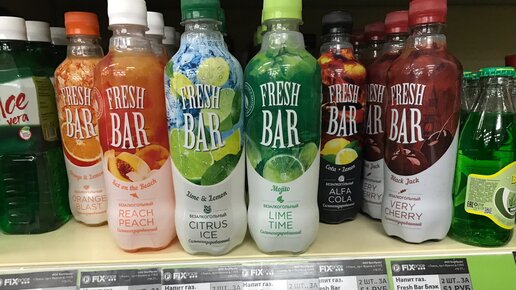В фикс прайсе фрэш бар представлен разными вкусами: Orange&Lemon, Sex on the Beach, Lime&Lemon, Mojito, Cola+Lemon, Black Jack.