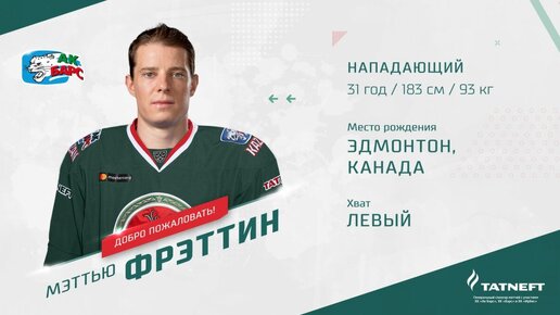 «Ак Барс» заключил контракт с форвардом Мэттью Фрэттином – соглашение рассчитано до конца сезона 2019/20. Мэттью Фрэттин родился в Эдмонтоне (Канада) 3 января 1988 года. В 2007 году выбран в 4-м раунде драфта НХЛ под 99-м номером клубом «Торонто Мэйпл Лифс». На профессиональном уровне выступал за команды «Торонто Мэйпл Лифс» (НХЛ), «Торонто Марлис» (АХЛ), «Лос-Анджелес Кингз», «Коламбус Блю Джекетс» (обе – НХЛ), «Стоктон Хит» (АХЛ), «Лозанна» (Швейцарская национальная лига), «Барыс» (КХЛ). В прошедшем сезоне сыграл 64 матча, в которых набрал 50 (26+22) очков при показателе полезности +5...