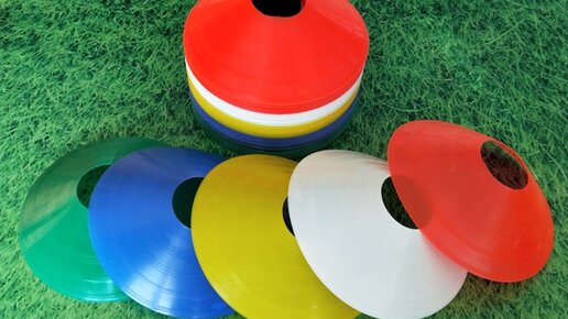 Это фишки, конусы и кольца и сейчас мы немного расскажем что с этим делать. И так начнём. Третье место. ФИШКИ Наверное это самый универсальный помощник футболиста во время тренировок. Их можно использовать как угодно, от разметки мини ворот или позиции, до преград для тренировки дриблинга, скорости и ловкости...