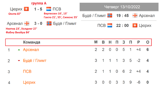 Это результаты, таблица и список бомбардиров Лиги Европы. Таблица. У Арсенала – 6 очков. Будё/Глимт и ПСВ набрали по 4 очка, у Цюриха – 0. Как вы помните, один матч группы был перенесён. Арсенал и ПСВ сыграют 20 октября. Таблица. Фенербахче и Ренн имеют по 7 очков. Команды не проиграли ни разу. У АЕКа – 3, Динамо на последнем месте. В третьей группе команды сыграли в разное время. Таблица. Бетис идёт без потерь. У Лудогорца – 4 очка, у Ромы – 3, у ХИКа - 1. В четвёртой группе зафиксировано две победы гостей...