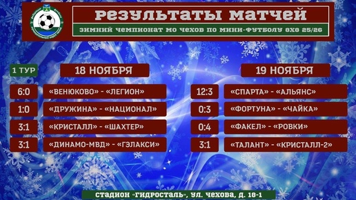 ✨ Наши новости! ❄️ ЗИМНИЙ ЧЕМПИОНАТ МО ЧЕХОВ ПО МИНИ-ФУТБОЛУ «8×8» ⚽️ 🏟️ Результаты матчей Зимнего Чемпионата муниципального округа Чехов по мини-футболу сезона 2025/2026, которые прошли 18 и 19 ноября на стадионе «Гидросталь» 🏟️ 👋 До встречи...
