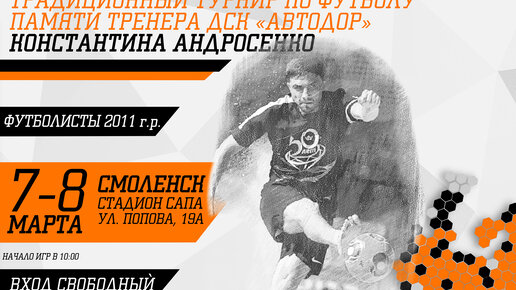 7 и 8 марта в Смоленске на стадионе САПА состоится ставший уже традиционным футбольный турнир среди юношеских команд, посвященный памяти тренера детско-спортивного клуба «Автодор» Константина Андросенко. В соревнованиях примут участие 8 команд. В памятном футбольном турнире, который проводится уже третий год подряд, примут участие 8 юношеских команд 2011 года рождения, представляющие разные регионы страны. Помимо смоленских команд – «Автодор», «Олимпия», «Искра», СШОР-5 и «Макс», в турнире сыграют «Русь» (Десногорск), «Рапид» (Брянск) и «Чертаново» (Московская область)...