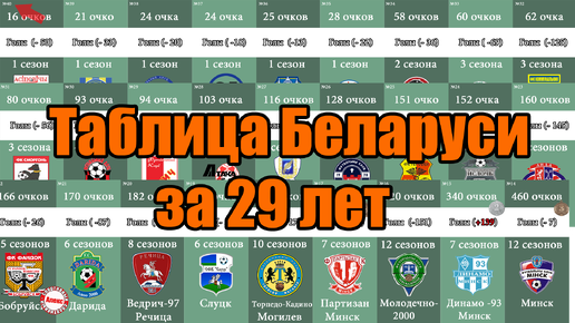 Как выглядит таблица чемпионата Беларуси по футболу за 29 лет?