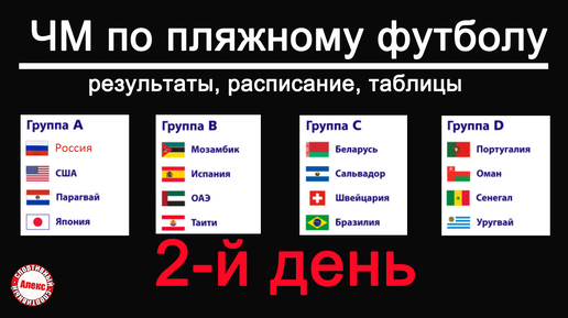 Чемпионат мира по пляжному футболу 2021. День 2. Таблицы, результаты, расписание.
