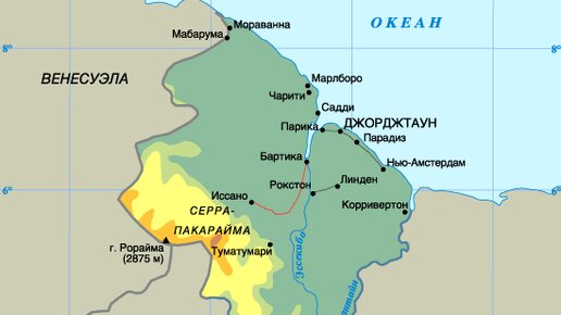 Гайана — страна, расположенная на северо-восточном побережье Южной Америки. Соседями Гайаны являются Венесуэла на западе, Бразилия на юге и Суринам на востоке. На севере её берега омываются водами Атлантического океана. Площадь Гайаны составляет около 214 970 квадратных километров, что делает её третьей по величине страной в Южной Америке после Бразилии и Аргентины. -- География и климат Гайана отличается разнообразным рельефом, который включает прибрежные равнины, холмами и обширные тропические леса...
