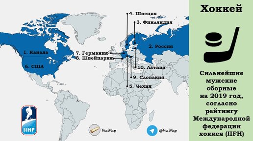 "Талант выигрывает игры, а команда — чемпионаты" Майкл Джордан Командные виды спорта приковывают своё внимание миллионов людей. Перед Вами рейтинги ТОП-10 сильнейших мужских сборных мира по популярным командным видам спорта. Хоккей с шайбой Действующий чемпион мира (2019): сборная Финляндии Действующий олимпийский чемпион (2018): Олимпийские спортсмены из России Сильнейшие сборные по хоккею сосредоточены в Северной Америке и Европе. Противостояние сборных России и Канады - изюминка данного вида спорта...