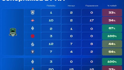 Быков в ближайшие 2 тура ждут «Балтика» и «Спартак» – % побед против них составляет всего-навсего 33%. Далее комфортные для команды «Акрон» и «Махачкала», а вот в конце – «Динамо» и борющийся за выживание «Оренбург» – там процент победы ~ 50%...