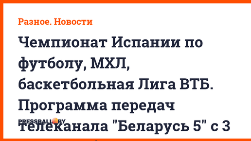Программа передач телеканала "Беларусь 5" с 3 по 9 октября 2022 года. Понедельник, 3 октября 07:00 Футбол. Чемпионат России. Премьер-Лига. 11-й тур. ФК Нижний Новгород — Спартак (Москва) 08:55 Итоги недели 09:40 Футбол. Беларусбанк — чемпионат Беларуси. 23-й тур. Обзор 10:25 Гандбол. СЕХА-Лига. Мешков-Брест — Машека (Могилев) 12:00 Футбол. Чемпионат Испании. Ла Лига. 7-й тур. Реал (Мадрид) - Осасуна 14:00 Большой спорт 14:45 Пит-стоп 15:20 Футбол. Чемпионат России. Премьер-Лига. 11-й тур. Локомотив (Москва) — Урал (Екатеринбург) 17:20 На грани фола...