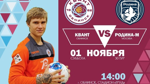 ⚽ Все на футбол 1 ноября! Приглашаем болельщиков 1 ноября в 14:00 на заключительную игру сезона. «Квант» примет на домашнем поле «Родина-М» из Москвы. Нашей команде нужна ваша поддержка. Встречаемся...
