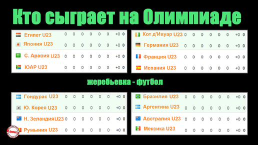 Зато 23 июля стартуют 32 летние Олимпийские игры, в рамках которых состоится футбольный турнир. Даты проведения 21 июля – 7 августа. Определились все участники, состоялась жеребьевка. Одно места забронировано для Японии. Остальные 15 мужских команд квалифицировались из 6 конфедераций. От Европы в финальную часть пробились: Испания, Германия, Румыния и Франция. Таблицы вы видите вверху. Сейчас узнаем их соперников, а пока расскажу, как проходил отборочный турнир в Океании с предсказуемым победителем...