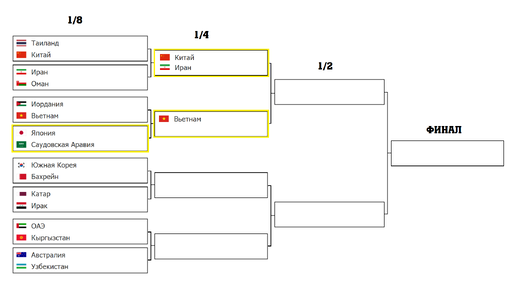 Привет всем. Результаты и расписание кубка Азии 2019 на «спортивном». После вчерашнего дня мы знаем, что Вьетнам довольно неожиданно прошел Иорданию, выиграв в серии. Китай, прибавив во втором тайме, сломил сопротивление Таиланда 2-1. И Иран разобрался с Оманом 2-0, так и не пропустив на этом турнире ещё ни одного мяча. Что говорить, если эта сборная ни разу в истории ещё не уступала Оману. Давайте вспомним, кто уже в ¼ финала. Я нарисовал красивую схему. В четвертьфинале между собой сойдутся Китай и Иран...