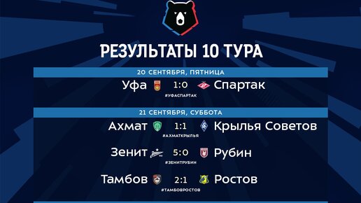 Завершился 10 тур чемпионата России по футболу. Подведем краткие итоги каждой игры. Ахмат-Крылья Советов 1-1 Битва соседей по таблице, У "Ахмата" забил Понсе после ошибки Рыжикова, и грозненцы во втором тайме должны были забивать еще, были хорошие контратаки, но не смогли, в результате чего поплатились в концовке матча. Мяч у "Крыльев" забил Карпов. Но у самарцев по ходу матча тоже были хорошие моменты, стоит отметить сейв Глушакова, который спас ворота своей команды от гола. Боевая ничья с множеством опасных моментов...
