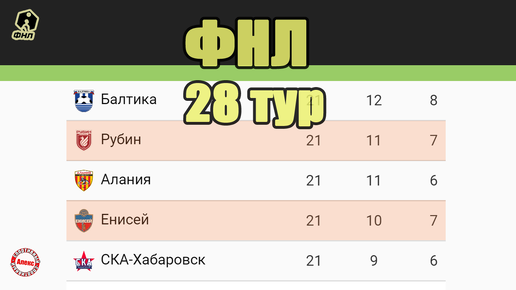 Здравствуйте, уважаемые любители футбола. Вашему вниманию результаты, таблица, расписание ФНЛ. В 28 туре показано 3 красные карточки. Реализован 1 пенальти. Забито 24 гола. Самый крупный результат (3-2). Самый минимальный счёт (0-1). Арсенал – Рубин (0-1). Рубин продлил беспроигрышную серию до 24 матчей. СКА – Волга (1-1). СКА набрал 4 очка за последние 8 туров. Динамо – Енисей (3-0) Родина – КАМАЗ (2-2) Шинник – Алания (0-1). Гурциев забил на 94-й минуте и вывел Аланию на третьей место...