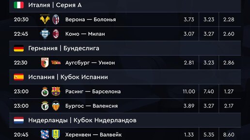 ! Как же мы могли оставить вас без расписания самых интересных матчей дня? 👀 Пусть игр сегодня не так много, но каждая из них заслуживает внимания. Особый интерес сегодня вызывают противостояния: 🇩🇪🇩🇪 Аугсбург — Унион (22:30) 🇮🇹🇮🇹...