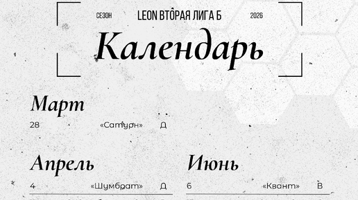 В новом сезоне LEON-Второй Лиги Б футбольный клуб «Спартак» снова выступит в Группе 3. Начало сезона намечено на 28 марта. Красно-белые первые два матча проведут на домашней арене. Соперниками красно-белых в сезоне 2026 станут 15 команд. По сравнению с прошлым сезоном состав участников изменился: Сезон тамбовчане начнут уже 28 марта. Первым соперником красно-белых станет раменский «Сатурн», который приедет в гости в Тамбов. Второй тур спартаковцы тоже проведут дома - против «Шумбрата» из Саранска...
