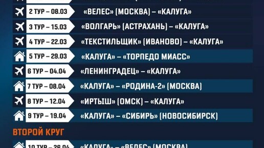 Пресс-служба футбольного клуба «Калуга» информирует о согласовании проекта календаря матчей весенней части сезона в подгруппе «Золото» Дивизиона «А» Второй лиги. Соревнования пройдут с 1 марта по 13 июня 2026 года и включат в себя 18 туров – по девять в первом и втором кругах. Согласно предварительному расписанию, первый круг стартует 1 марта выездным матчем против пятигорского «Машука-КМВ». Затем калужан ожидают ещё три гостевые встречи подряд: 8 марта – с московским «Велесом», 15 марта – с астраханским «Волгарём», 22 марта – с ивановским «Текстильщиком»...