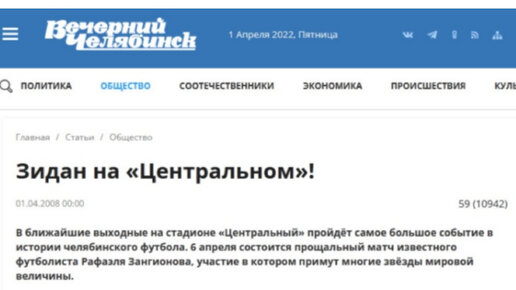 2008 год. Зидан на "Цетральном"!🏟 Именно с таким заголовком вышла статья в Вечернем Челябинске 📰 в 2008 году. Известный футболист Рафаэль Зангионов( Андерлехт 🇧🇪, Анжи🇷🇺, Алания 🇷🇺)6 апреля собирался провести прощальный матч, в котором сборная друзей Зангионова должна была схлестнутся против сборной Мира 🌏. С 2003 по 2006 Рафаэль был одним из лидеров челябинского Спартака🇷🇺, но команда развалилась и следующий сезон футболист провёл в Липецке, где был признан лучшим игроком зоны центр...