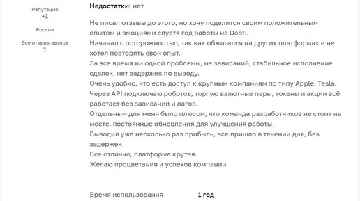 Daoti.io — торговая платформа, которая всё чаще появляется в обсуждениях трейдеров, особенно в среде алготрейдинга. Пользователи отмечают стабильность, быстрый вывод средств, удобный API и доступ к криптовалютам и акциям США в одном интерфейсе. В этой статье собраны реальные отзывы о Daoti.io, основанные на опыте трейдеров с разным подходом к торговле. Отзыв №1. Год торговли без проблем Один из пользователей делится опытом годовой работы на Daoti.io. Он отмечает, что начинал с осторожностью, но за всё время не столкнулся ни с зависаниями, ни с проблемами при выводе средств...