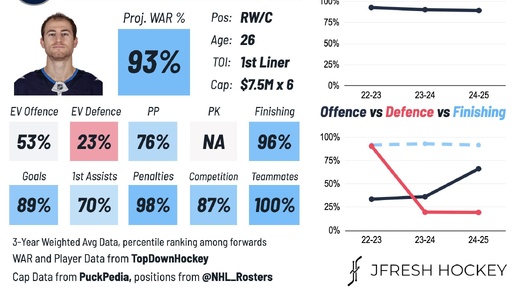 ✈️ Новый контракт Габриэля Виларди 6 лет по 7,5 млн — хорошие условия, когда речь идёт о форварде 25 лет, способном играть как в центре, так и на правом краю нападения, только что набравшем 61 балл в 71 игре. На бумаге всё выглядит просто замечательно. Однако не всё так хорошо: 1. Гэйб Виларди — очень травматичный игрок. Из 204 возможных игр в ОХЛ (за три сезона, что он там провёл) сыграно 123. В АХЛ сыграно 32 (+10 в НХЛ) из 68 в сезоне 2019-20. В НХЛ из 384 возможных сыграно 260, начиная с сезона 2020-21, когда игрок перестал уезжать в АХЛ...