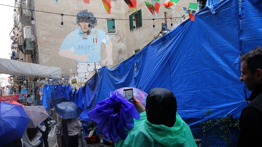 Всемирно известное граффити с изображением легенды мирового футбола Диего Марадоны в итальянском Неаполе завесили уличные торговцы белой тканью в знак протеста против действий местной полиции. Изображение Марадоны в городе, где Марадона становился чемпионом Италии с "Наполи" в 1987 и 1990 годах, ежедневно привлекает большое число туристов. В Неаполе Марадону считают небожителем. Вокруг уличного монумента продают сувениры и всевозможные другие товары, связанные с городом или футболистом, иногда без законной лицензии...