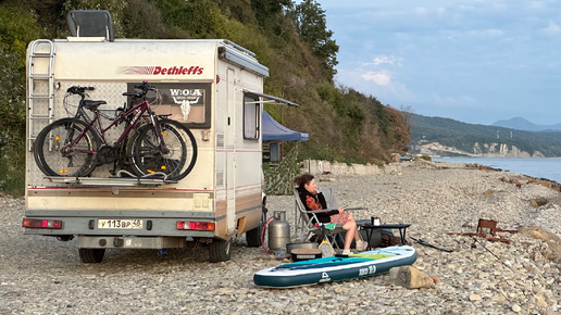 11 октября 2024. Мы успешно добрались до Черного моря. На смену "бархатному" сезону пришел фактически "мертвый". Большинство кемпингов закрыто, нигде не берут трубку... Но мы нашли работающий "Берег мечты" рядом с Джубгой. До этого мы пару дней постояли дикарями просто на обочине у моря в Новомихайловском, затем поехали снимать обзор производства домов на колесах в Адлер. Наш автодом оставляли у вокзала в Туапсе и поехали на "Ласточке". С электричеством всё в порядке, солнца пока хватает. Литий...