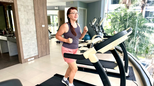 Занятия в тренажерном зале с видом на бассейн и пальмы в Dusit Grand Park в Паттайе, посещение сауны, шагомер
