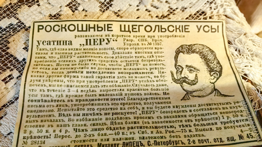 В поездке по Тульской области заехали в музей купеческого быта в Епифани. Мое внимание привлекли дореволюционные рекламные объявления. Это чудо, насколько они актуальны! На столике в доме, воссоздающим жилье купеческой семьи подшивка газет и отдельные рекламные объявления. Рекламируются пилюли для улучшения пищеварения, бритвы, приборы для лечения теплом ревматизма, подагры, ломоты и прочего. Некоторые объявления я сфотографировал. Итак, усатин «Перу» — средство для отращивания роскошных щегольских усов...